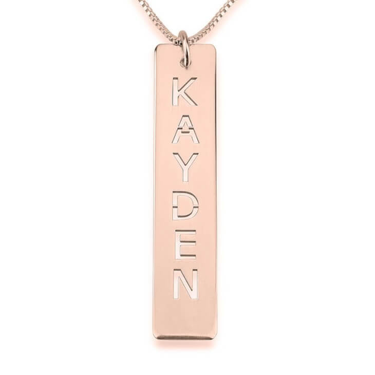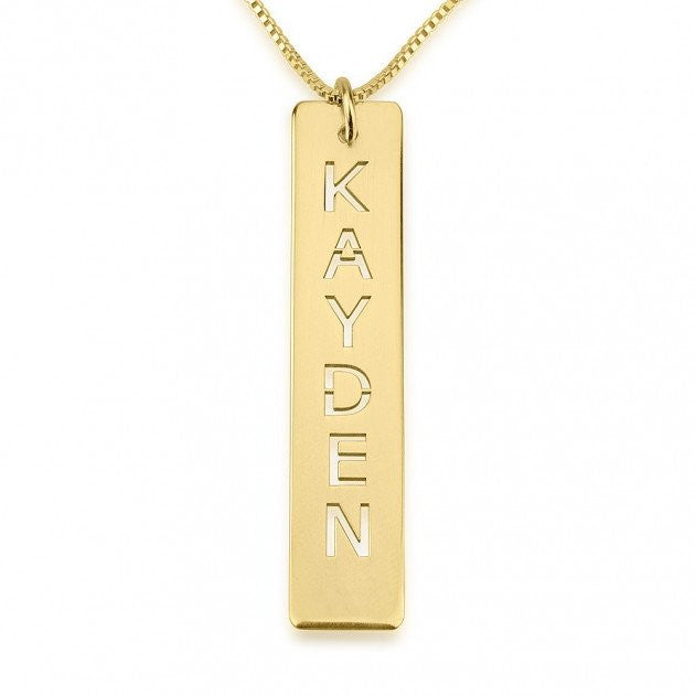 Engrave in this modern and simple high quality 24K Gold Plated or 0.925 Sterling Silver vertical bar necklace with a word or name of your choice. What makes this simple style truly special is the cut out style of the letters. If you are looking for a bar necklace that will pair well with every outfit, look no further.